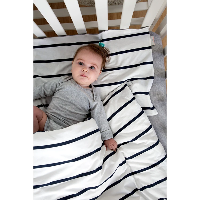 Cette parure de lit motif marin possède un coté rayé bleu foncé et un autre gris plus classique.