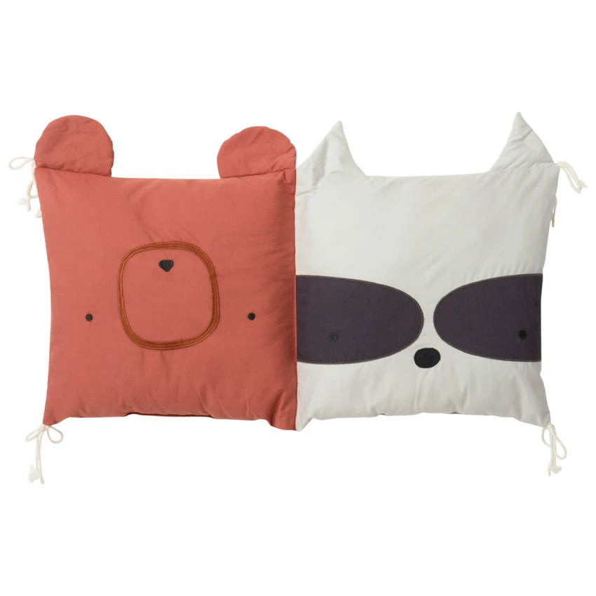 Un coussin décoratif pour moduler le tour de lit ou le tour de parc de bébé, composé d’un pan en forme d’ours et un pan en forme de raton laveur.