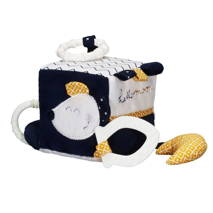 Cube d’activités Hello utilisable dès la naissance. Idéal pour un cadeau de naissance, il éveillera bébé aux sons, aux couleurs et au toucher.