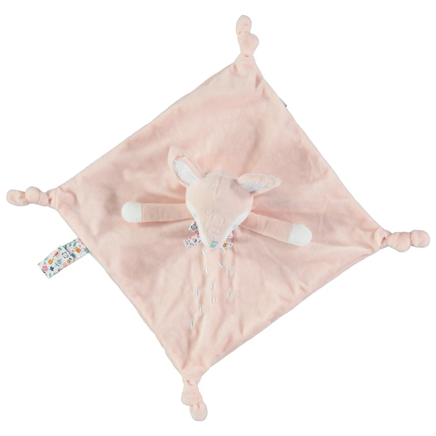 Doudou mouchoir en velours avec tête de renard et détails fleuris. Noeuds aux extrémités.