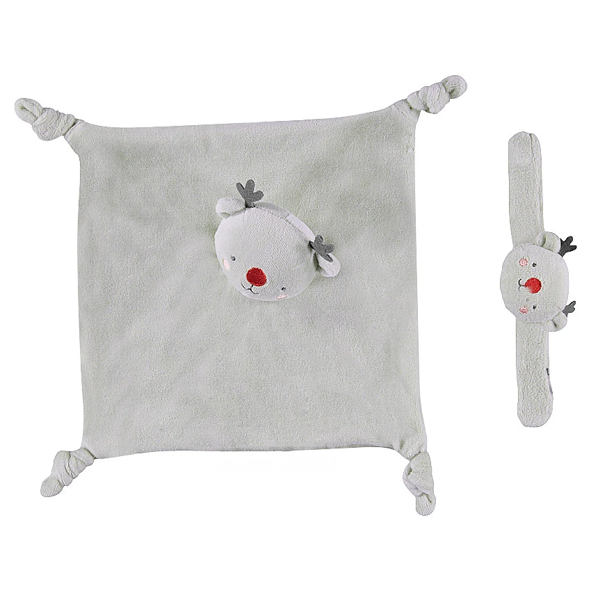 Hochet bracelet avec tête d’élan ouatinée. Détails brodés.