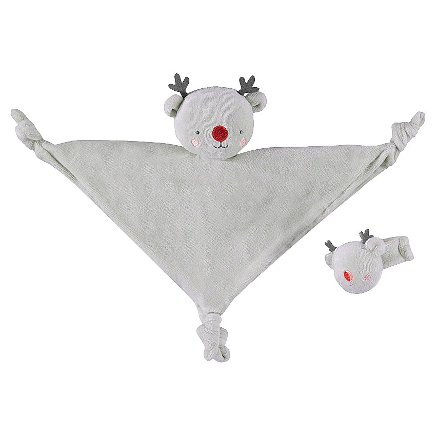 Doudou plat en velours. Noeuds aux extrémités. Tête d’élan ouatinée. Détails brodés.