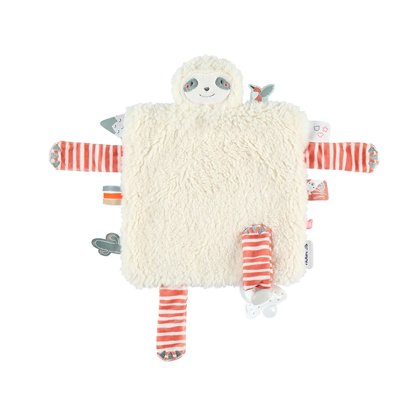 Grâce à son attache en velcro, le tidou Moris de la collection Moris & Sacha s’attache facilement à la manche du pyjama Noukie’s ou à la sucette.