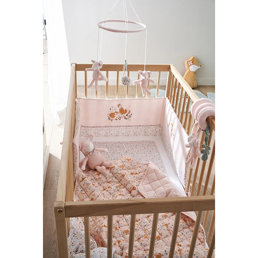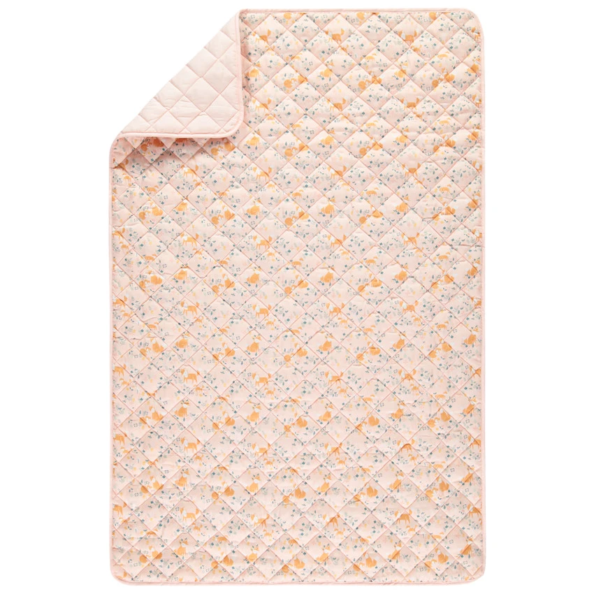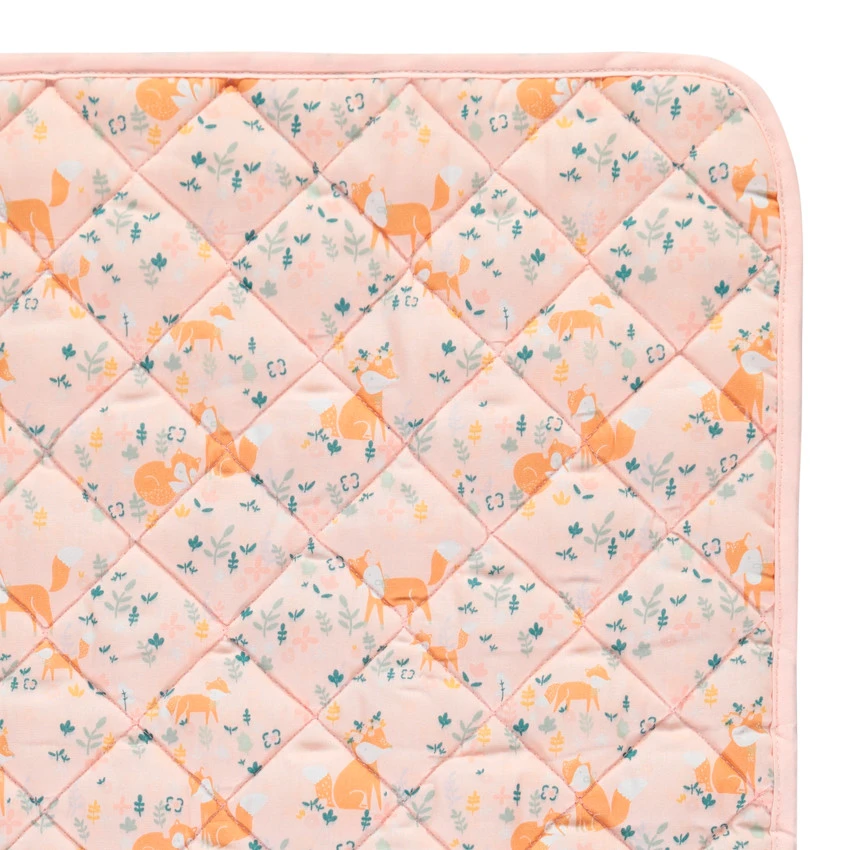 Plaid édredon en coton avec croisillons et imprimé renards et feuilles, revers rose.