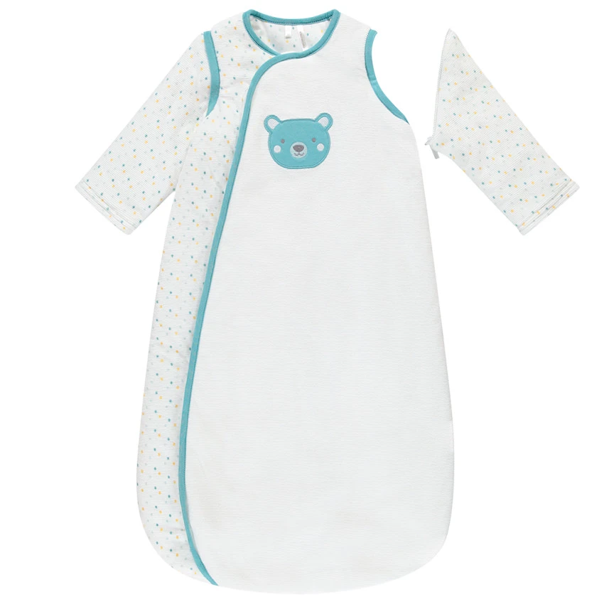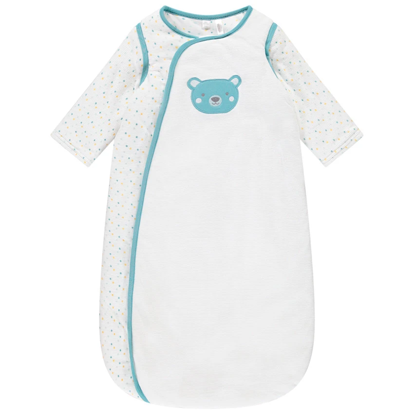 Gigoteuse en maille ottomane. Manches amovibles par zip. Ouverture zippée sur le devant. Ours brodé sur la poitrine. Pois colorés placés.