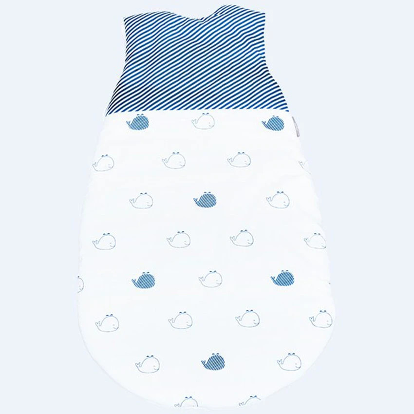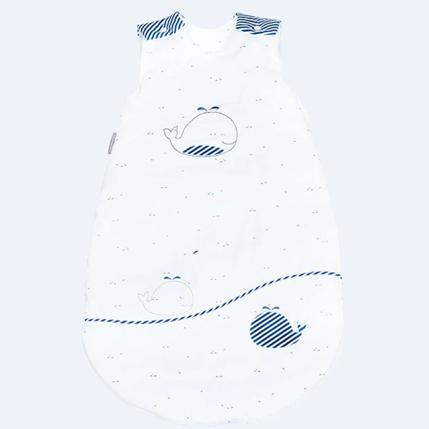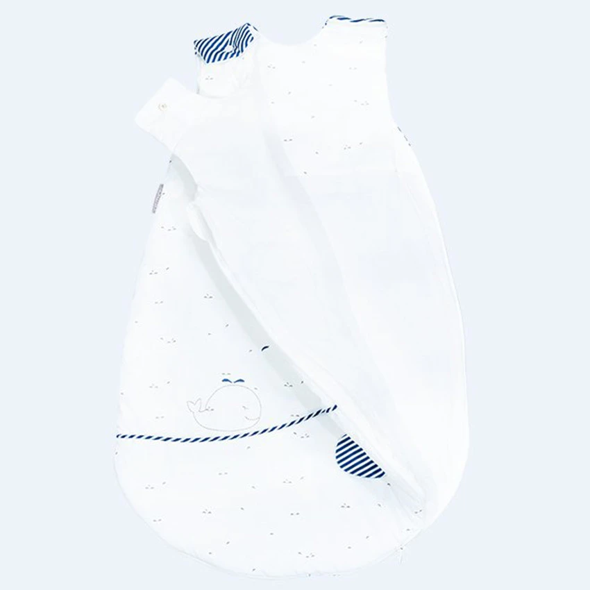 Blue baleine accompagnée de ses baleineaux naviguent sur les flots. Une gigoteuse hiver douce et graphique où le bleu minéral contraste avec le blanc optique des imprimés.