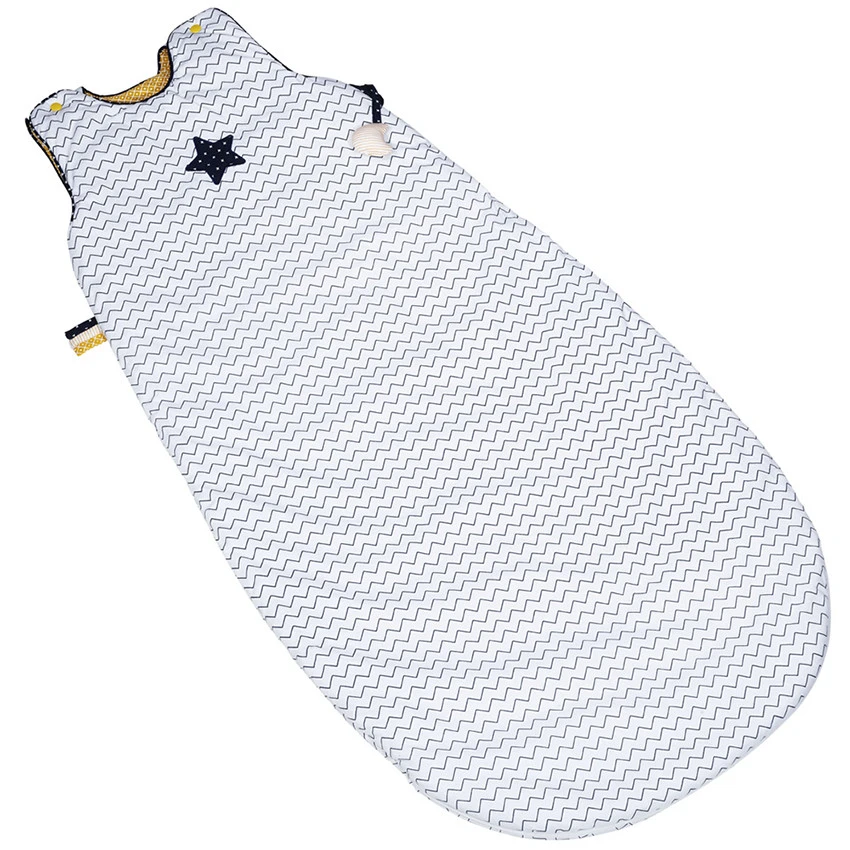 Direction la lune accompagné de la joyeuse bande de la Happy family. La grande gigoteuse réglable Hello aux motifs graphiques bleu-marine et blanc habillera garçons et filles pour les nuits d’hiver.
