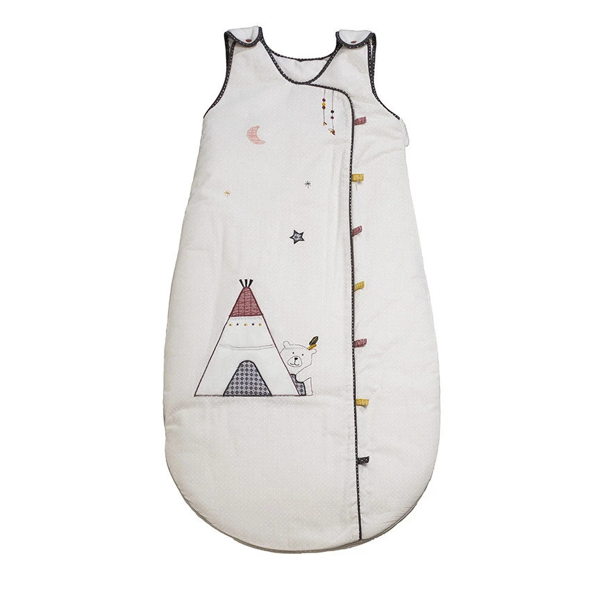 Son thème indien, délicatement brodé, fait voyager bébé jusqu’en Amérique, en compagnie de l’ours Timouki.