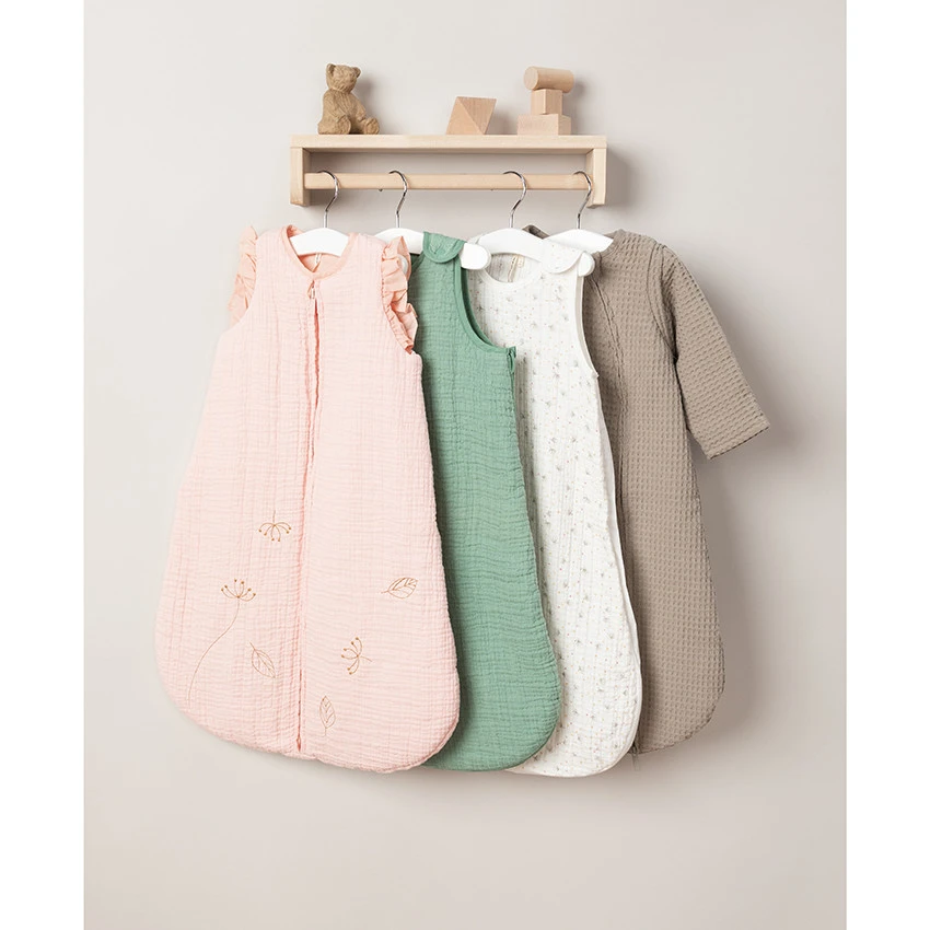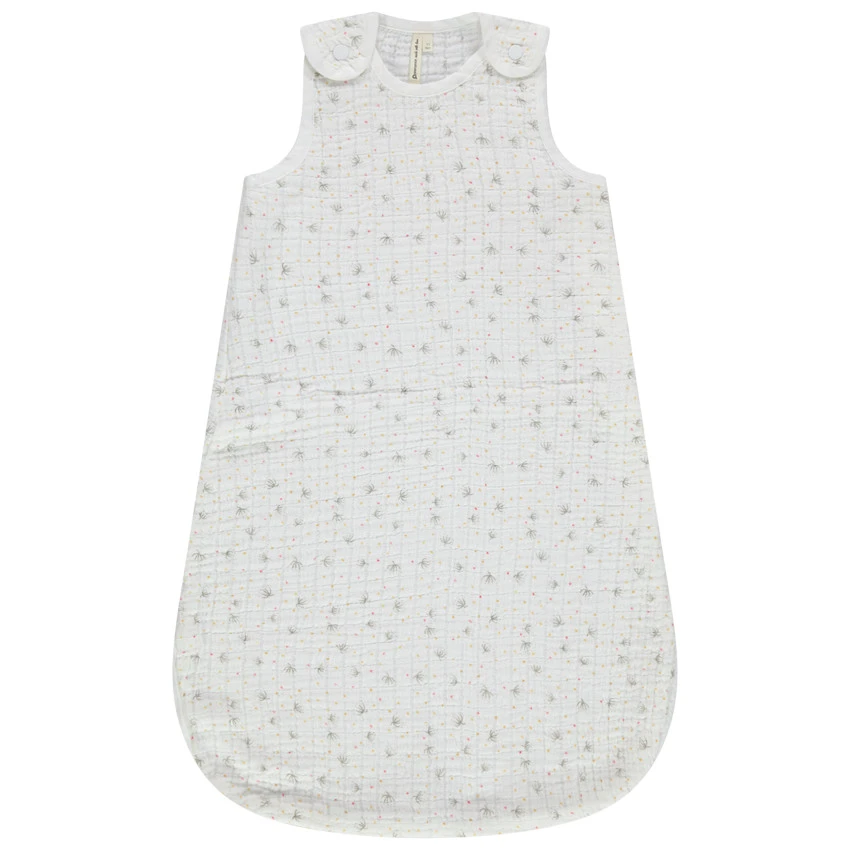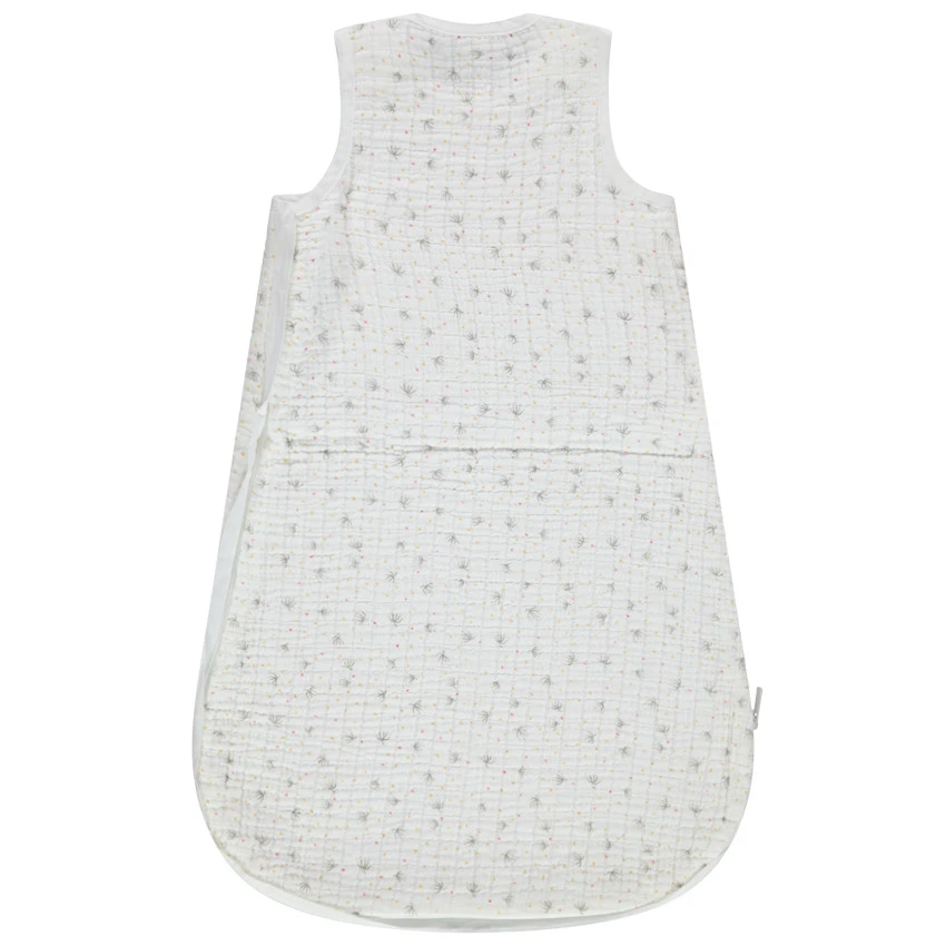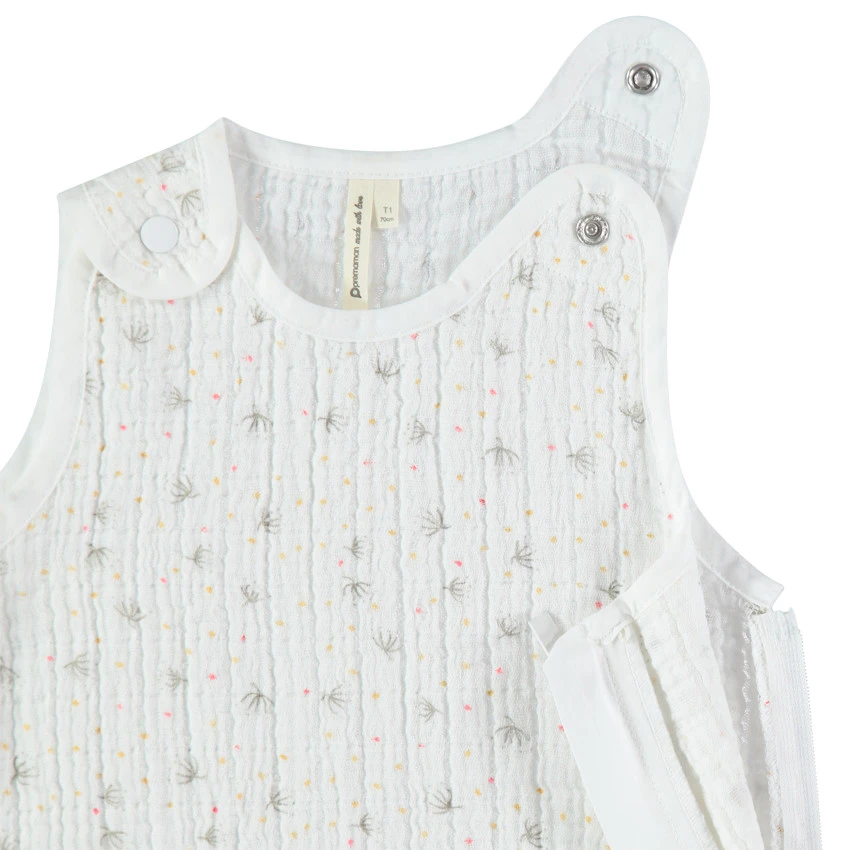 Gigoteuse sans manches en gaze de coton avec un petit imprimé fantaisie. Oeko-tex. Bretelles pressionnées. Ouverture zippée sur le côté pour faciliter l’habillement de bébé.