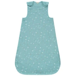 Gigoteuse sans manches avec étoiles imprimées en gaze de coton. Bretelles pressionnées. Ouverture zippée sur le côté pour faciliter l’habillement de bébé.
