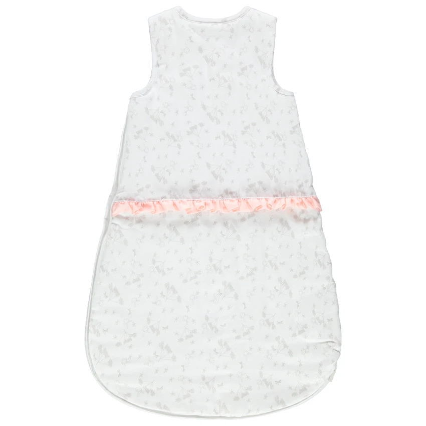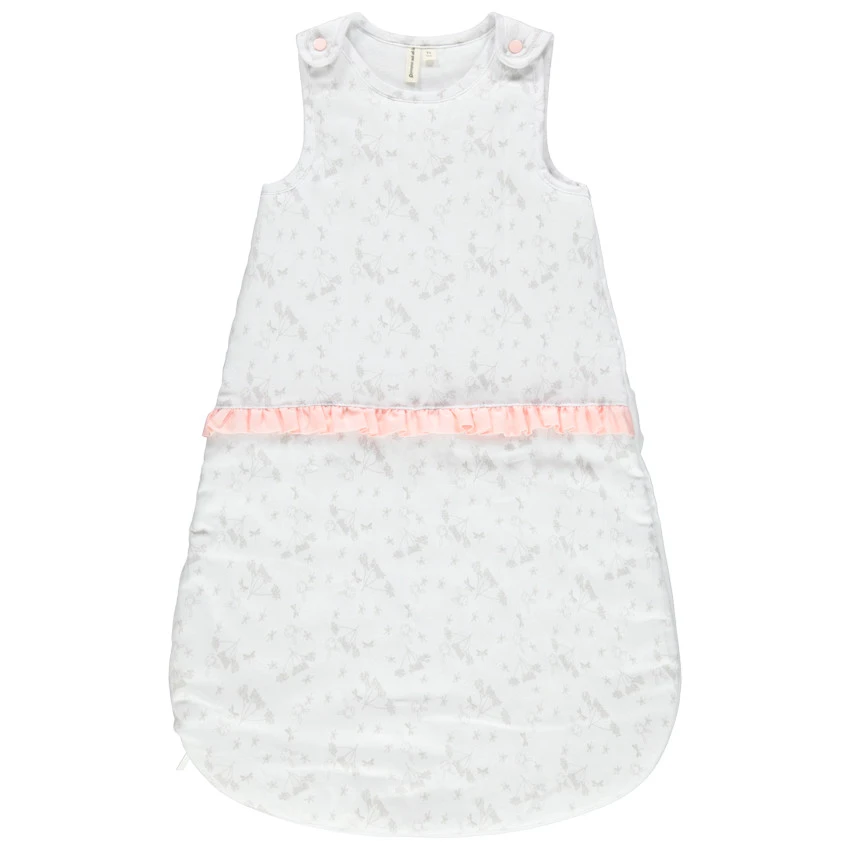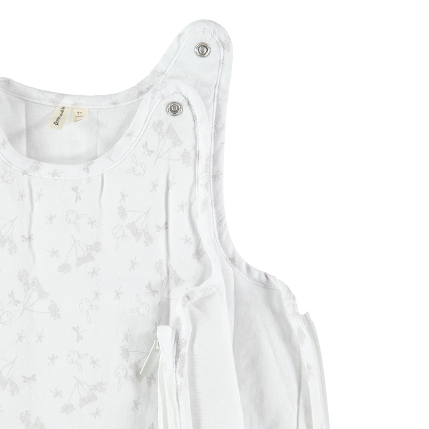 Gigoteuse sans manches en satin de coton imprimé fleuris. Volant sur le devant. Doublure en jersey. Bretelles pressionnées. Ouverture zippée sur le côté pour faciliter l’habillement de bébé.