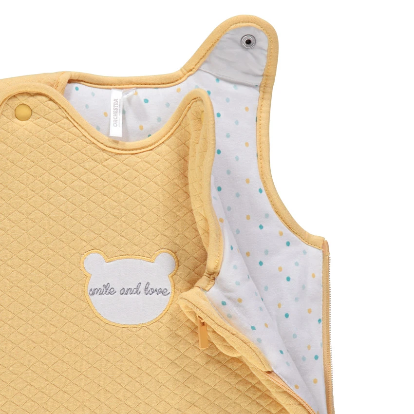 Gigoteuse sans manches en maille fantaisie. Col rond. Bretelles pressionnées. Ourson brodé sur la poitrine. Ouverture zippée sur le côté. Doublure en jersey à imprimé fantaisie. Taille ajustable par pressions.