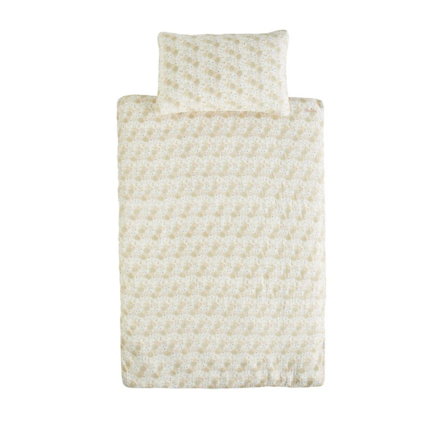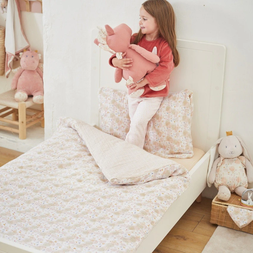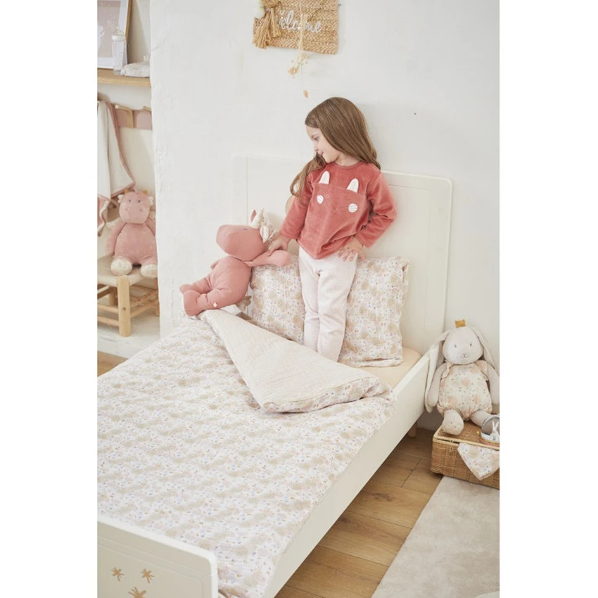 La housse de couette en mousseline de coton issu de l’agriculture biologique propose deux faces différentes coordonnées, un côté imprimé et l’autre rose et est accompagnée d’une taie d’oreiller présentant les mêmes motifs.