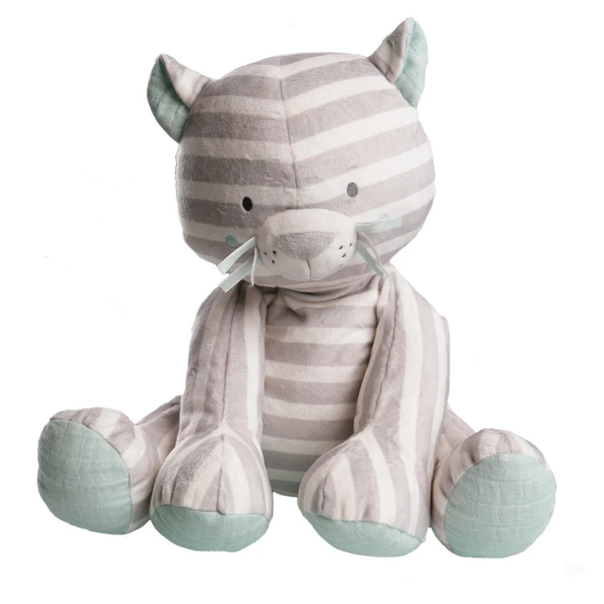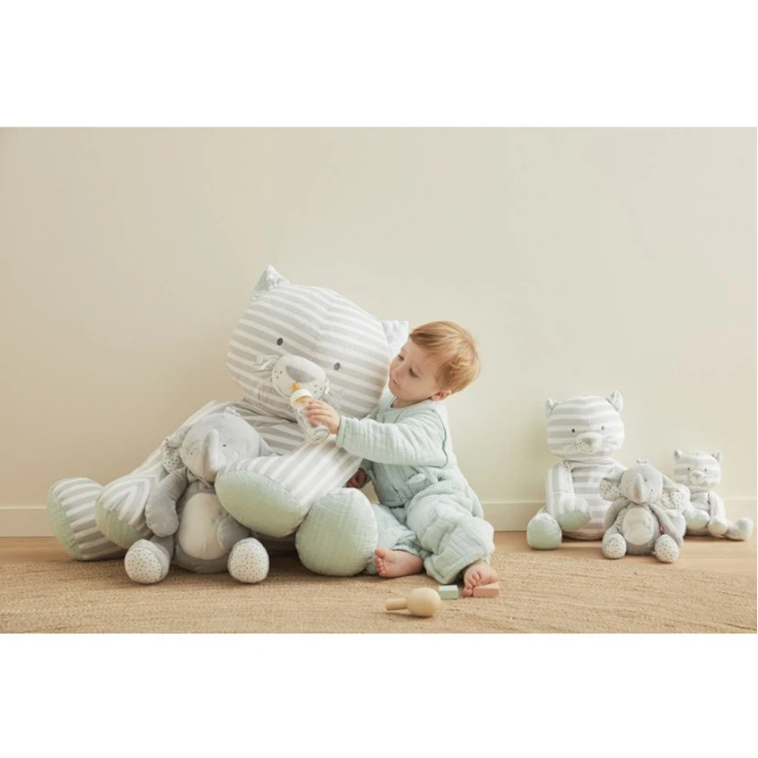 Trop craquante avec ses longues pattes et ses petites moustaches, dans les tons de gris, écru et vert pâle, cette peluche saura séduire bébé dès le premier regard.