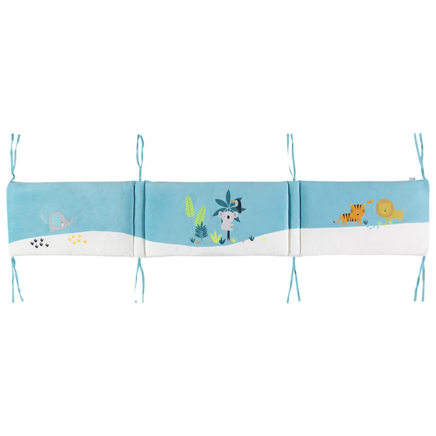 Pour un lit bien entouré et en toute sécurité, le tour de lit offre à bébé des nuits confortables. Tour de lit en velours bicolore de 3 pans avec motifs animaux de la jungle. Ouatinage à l’intérieur. Nouettes pour le fixer aux barreaux du lit.