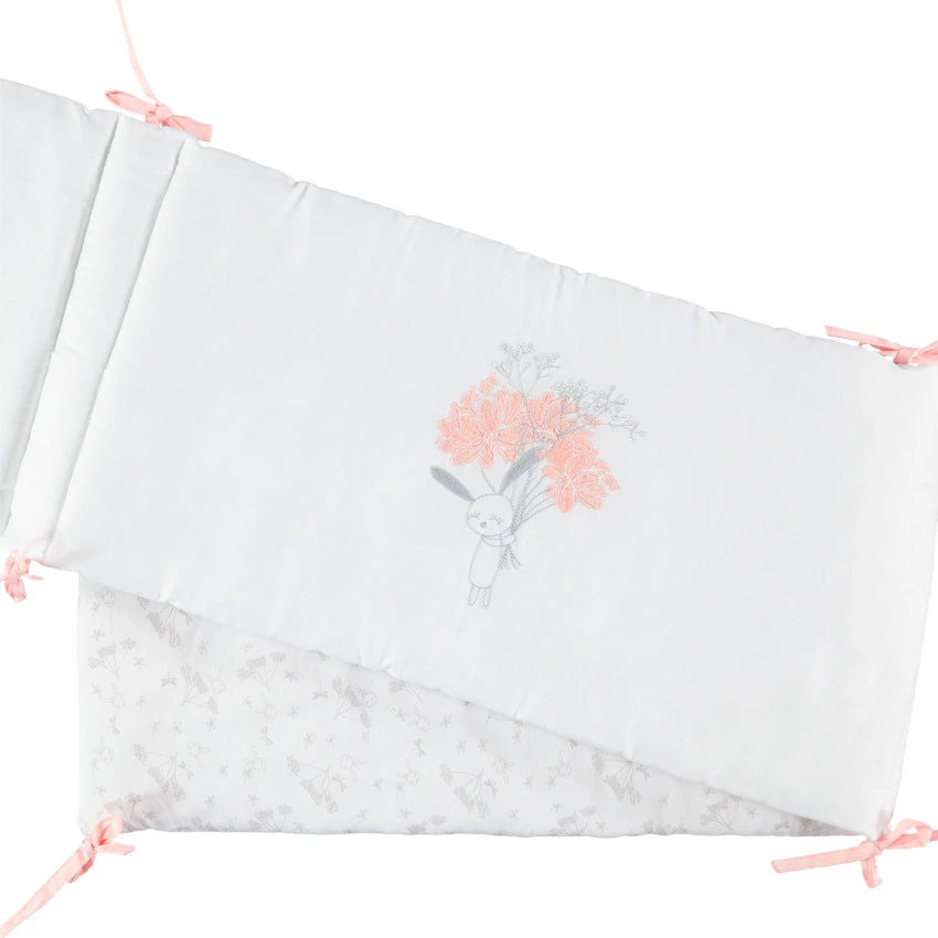 Pour un lit bien entouré et en toute sécurité, le tour de lit offre à bébé des nuits confortables. Tour de lit en satin de coton de 3 pans avec motif lapin. Doublure intérieure ouatinée. Revers imprimé fleurs. Nouettes pour le fixer aux barreaux du lit.