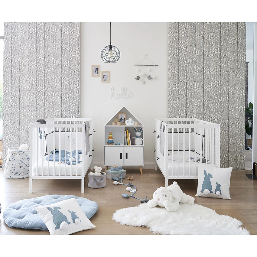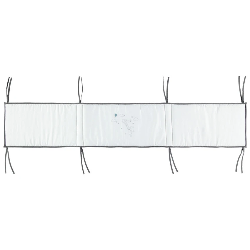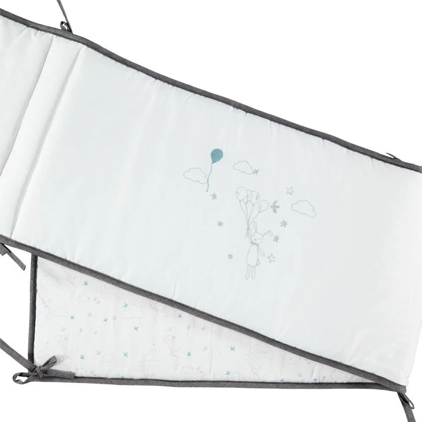Pour un lit bien entouré et en toute sécurité, le tour de lit offre à bébé des nuits confortables. Tour de lit en satin de coton de 3 pans avec motif lapin. Doublure Intérieur ouatinée. Revers imprimé étoiles. Nouettes pour le fixer aux barreaux du lit.