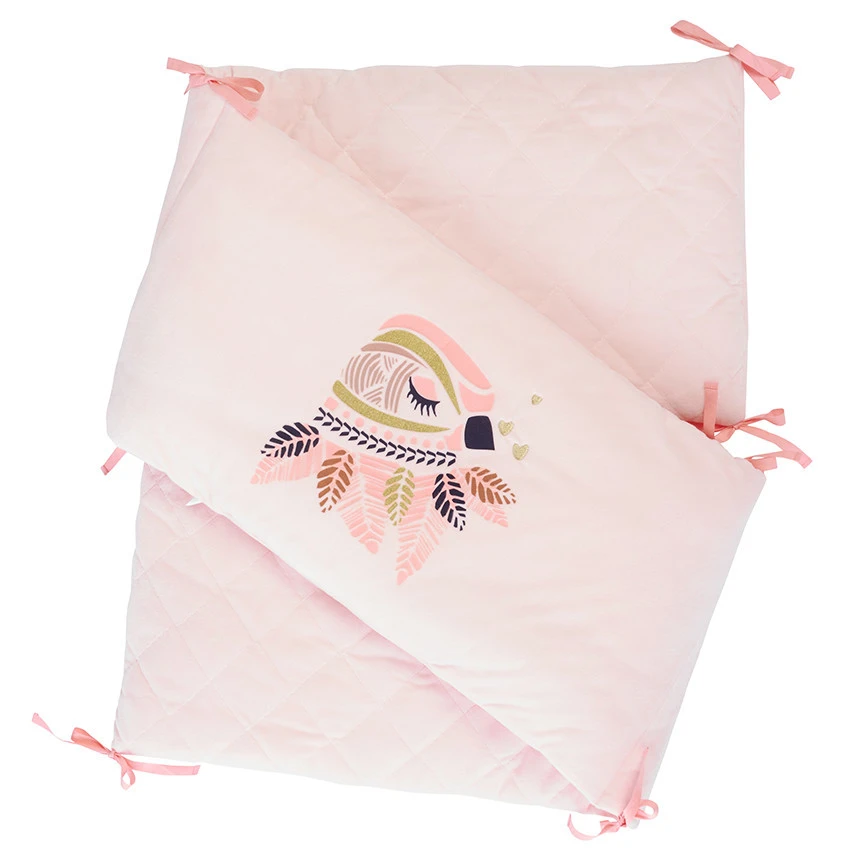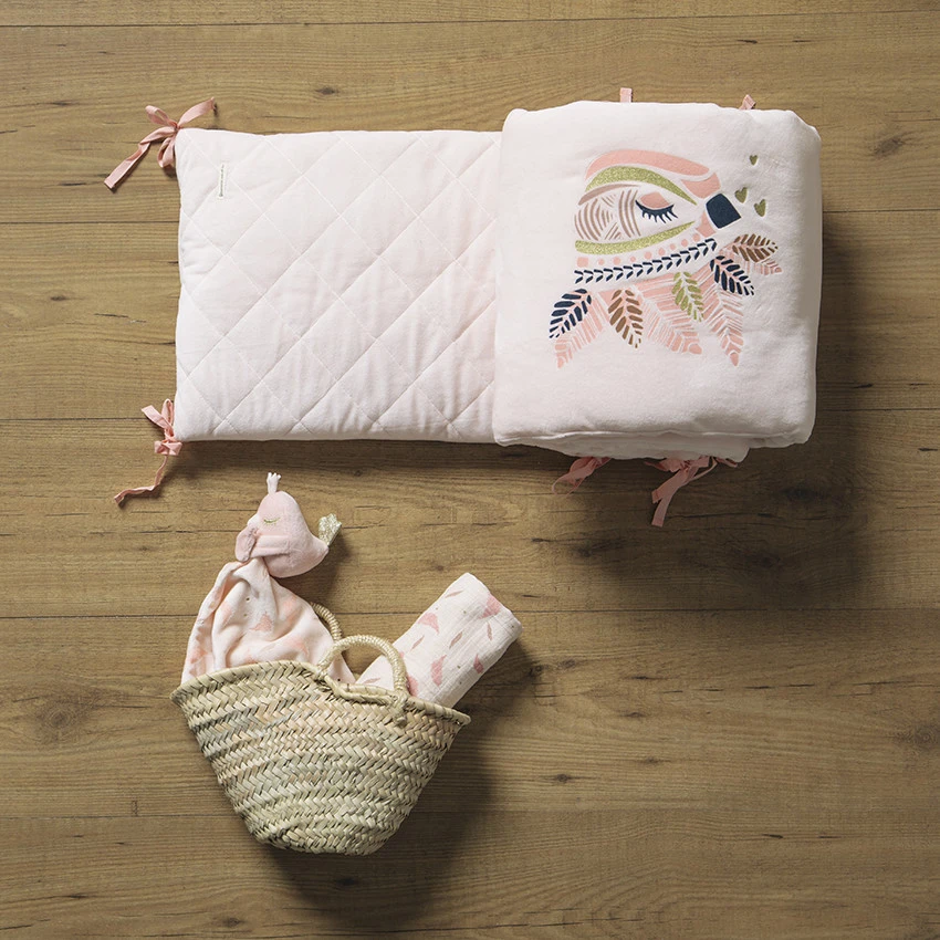 Pour un lit bien entouré et en toute sécurité, le tour de lit offre à bébé des nuits confortables. Tour de lit ouatiné en velours de 3 pans effet matelassé et motif oiseau sur le pan du milieu. Nouettes pour le fixer aux barreaux du lit.